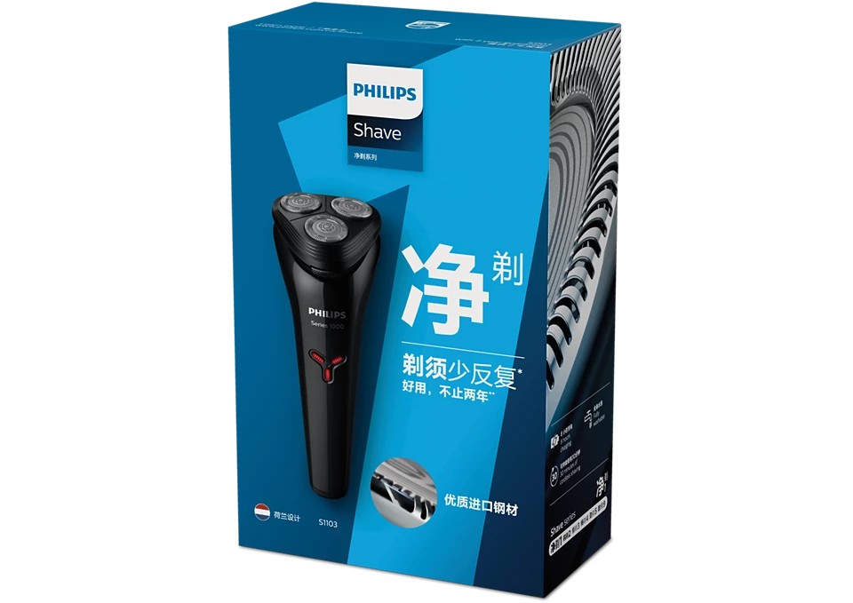 Philips S1103/02 Series 1000 — máy cạo râu nhỏ gọn, tiện dụng với đầu cạo linh hoạt 3 hướng, 27 lưỡi thép tự mài PowerCut, cạo khô hoặc ướt, pin dùng đến 30 phút sau 8 giờ sạc, chuẩn chống nước IPX7 — dễ vệ sinh và phù hợp du lịch.